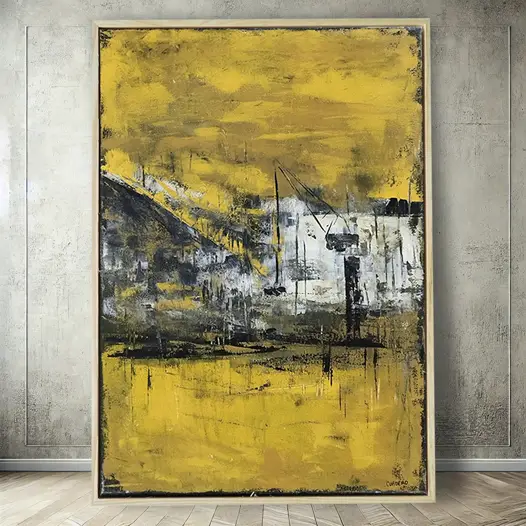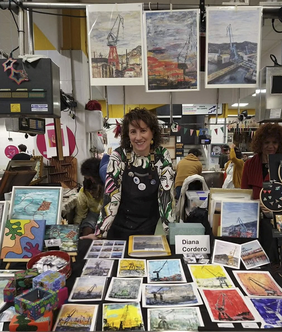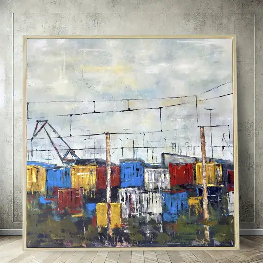 Como autora de las reconocidas pinturas portuarias de Vigo, mi ciudad natal, he desarrollado un estilo único inspirado en sus grúas, barcos y grandes contenedores que forman parte del paisaje industrial de su puerto.
