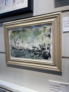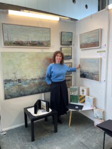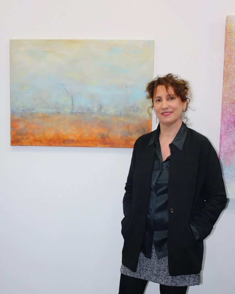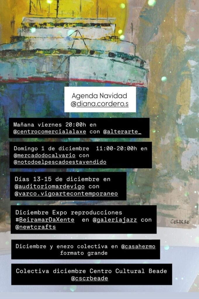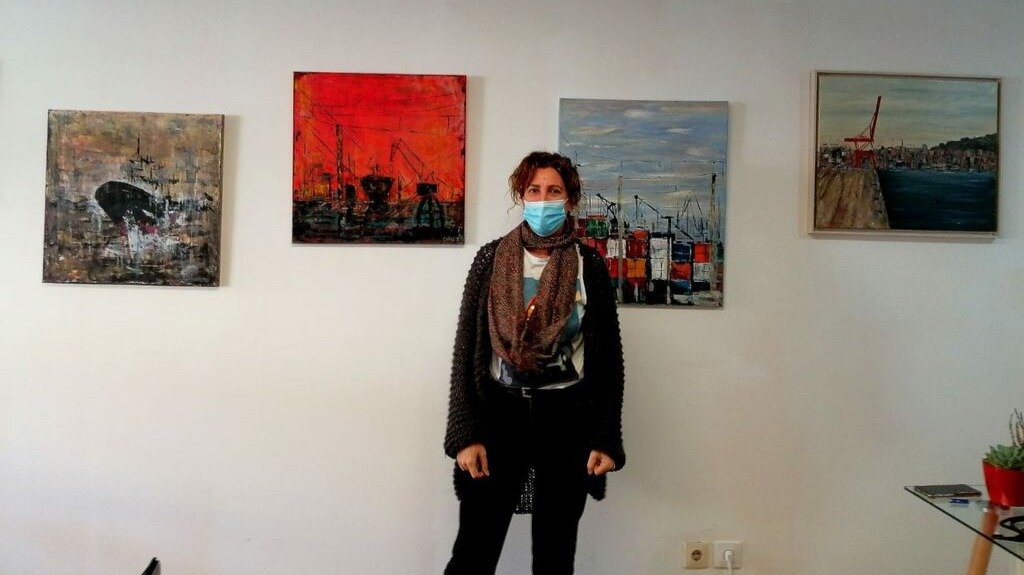 Como captura la esencia del paisaje industrial de Vigo con acrílico y espátula, enfocándose en elementos como grúas y contenedores. Además, participa en exposiciones itinerantes y fusiona arte con moda, destacando su versatilidad artística.